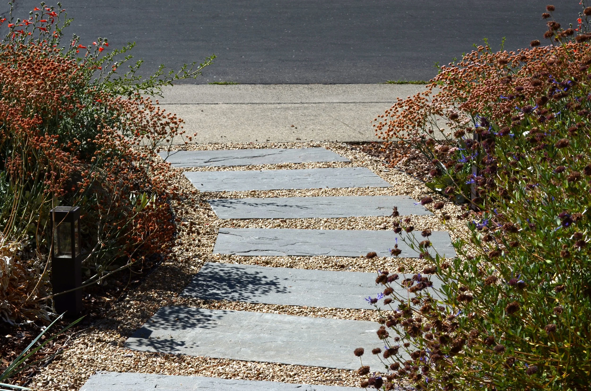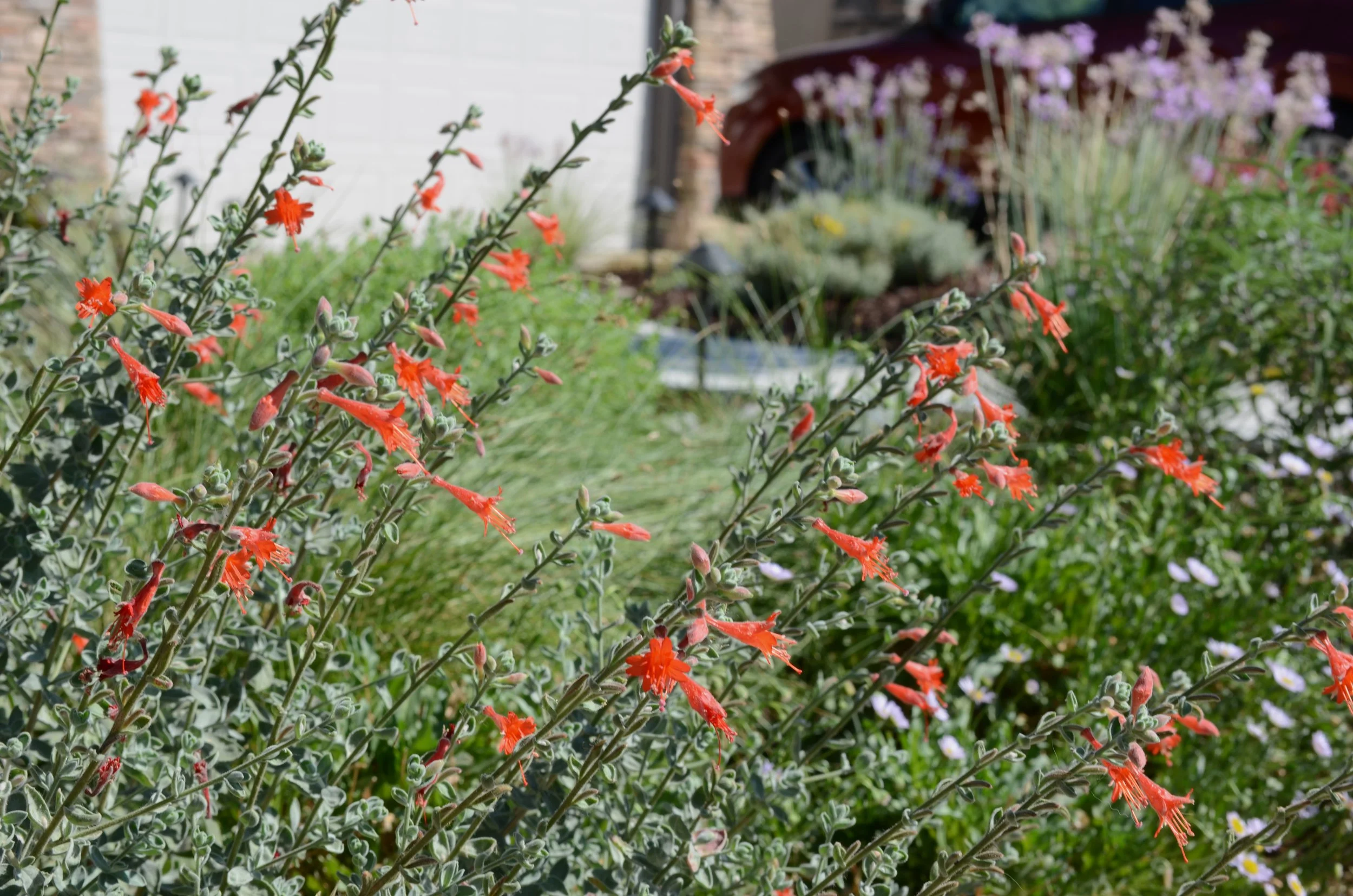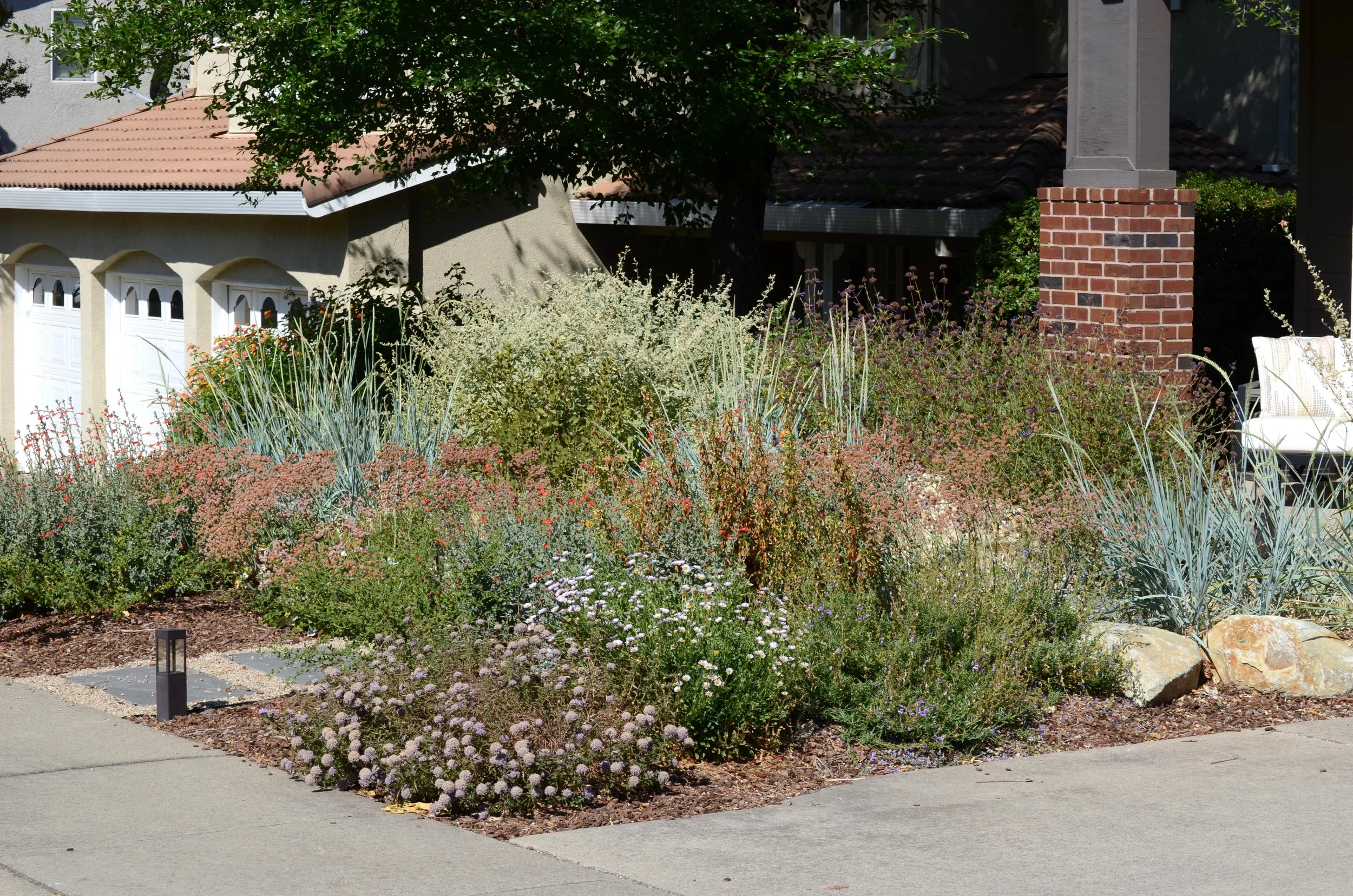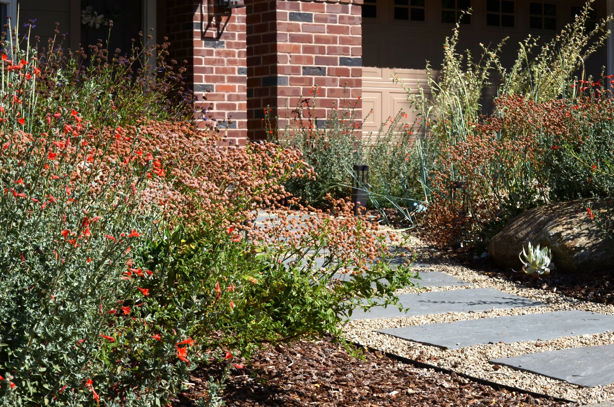 This front yard project is located in a neighborhood where conventional lawns are the norm. The clients wanted to demonstrate how a design using native plants can provide habitat and water savings while still abiding by HOA guidelines. Their garden has become an oasis of flowers where you can spot a variety of bees, dragonflies, and hummingbirds. Hopefully it will inspire passersby to consider native plants for their own yards!